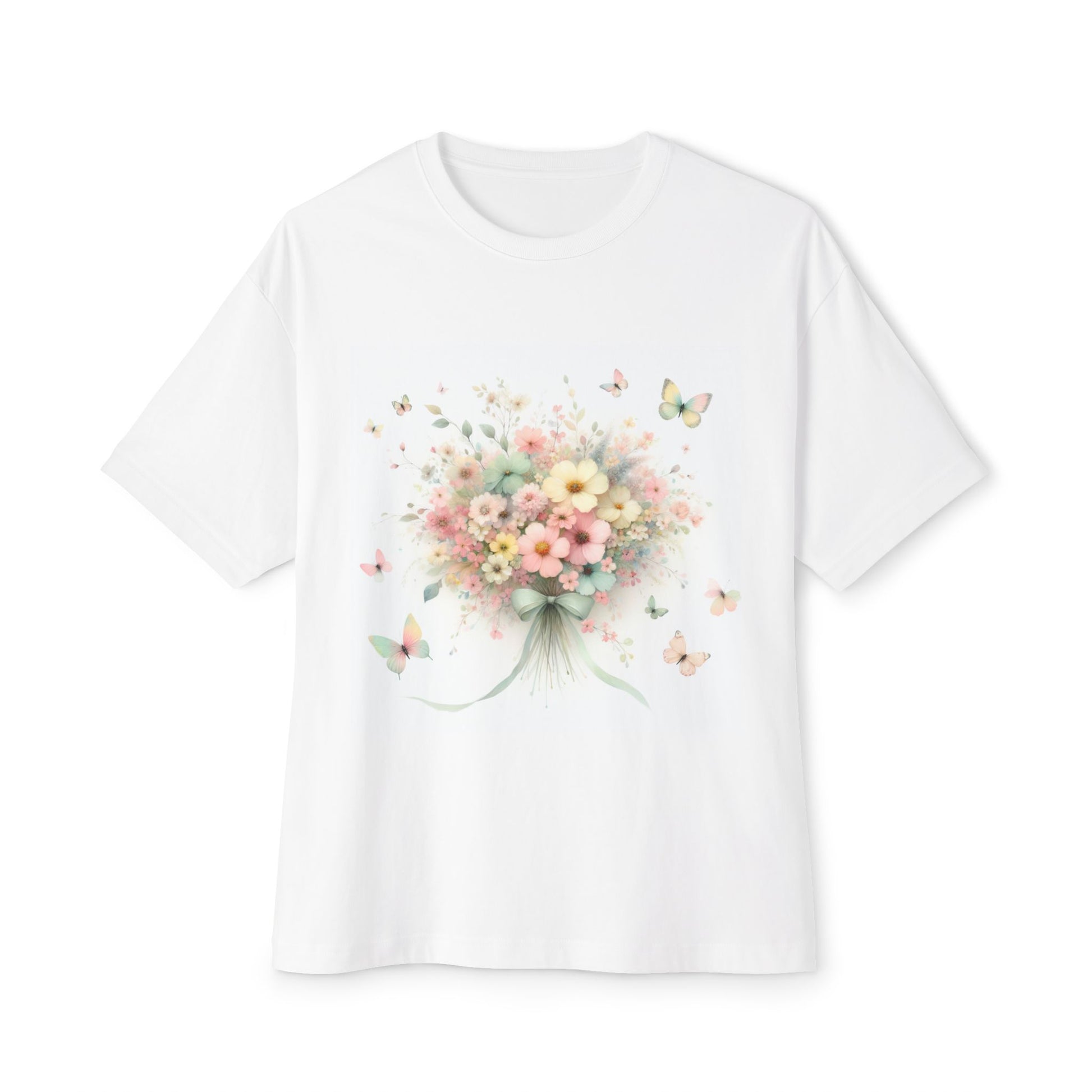A whimsical watercolor floral bouquet with delicate butterflies in soft pastel colors, on a white oversized t-shirt. This relaxed-fit tee gives off a calming and feminine vibe, perfect for those who appreciate nature-inspired designs. Ideal for casual wear, lounging at home, or as a statement piece for a casual outfit. Relevant for springtime, Easter, Mother's Day, and everyday wear.